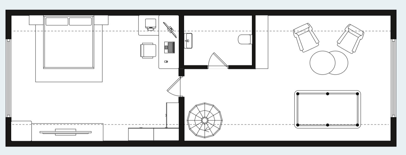 Dom DEX106 posiada powierzchnię parteru powierzchni użytkowej 106 m², który oferuje przestronny salon połączony z kuchnią, 3 niezależne sypialnie, łazienkę i WC.