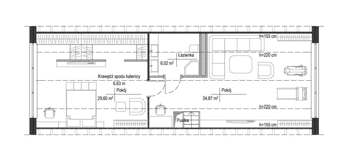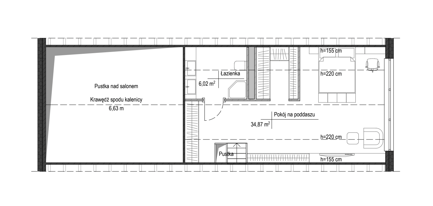 DEX 106 ma możliwość 3 konfiguracji poddasza : Wariant A to przestrzeń 50 m² na Twoje przedmioty (tzw. nieużytkowa), wariant B to przestrzeń częściowo użytkowa 40 m² z podwyższonym sufitem nad salonem, oraz wariant C z poddaszem użytkowym 75 m² do dowolnej aranżacji na pokoje, gabinet do pracy, łazienkę.